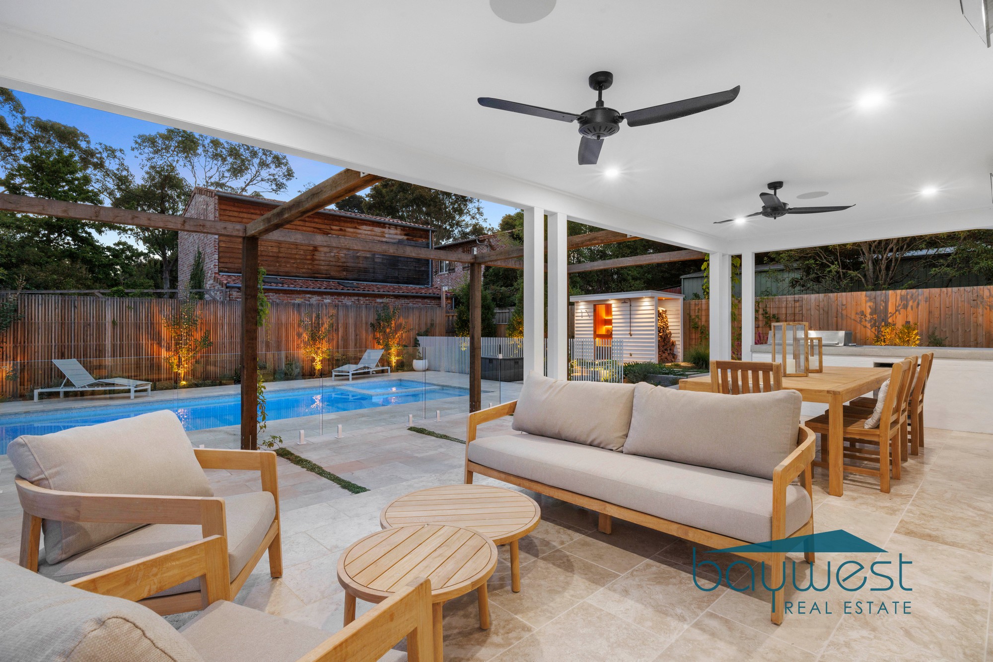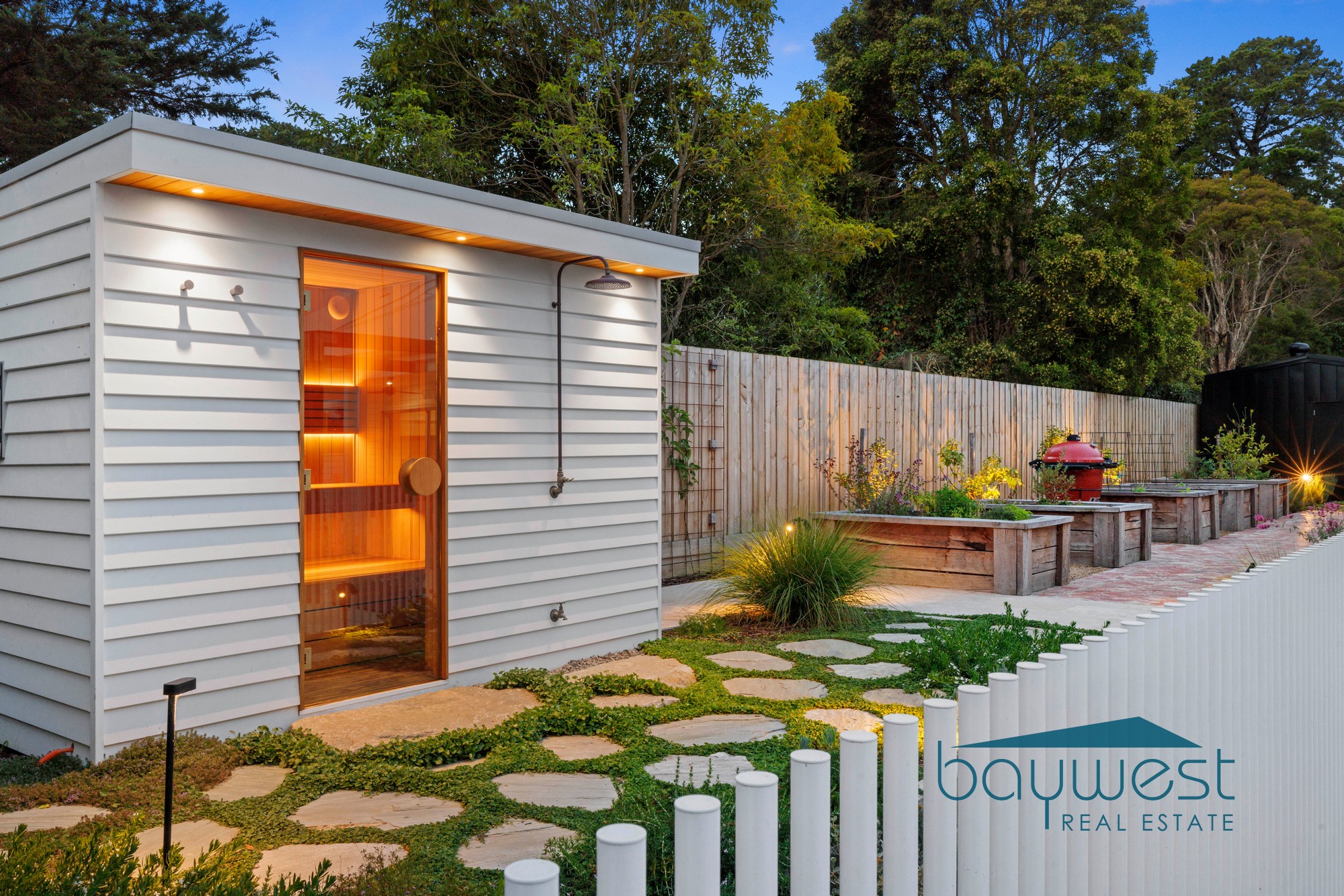 Step outside and discover an oasis rarely seen in residential living. A stunning naked-filtration swimming pool is complemented by an outdoor spa, sauna, and outdoor shower, creating your own private piece of paradise. Five established vegetable gardens enhance the property’s lifestyle appeal, blending luxury with sustainability.
