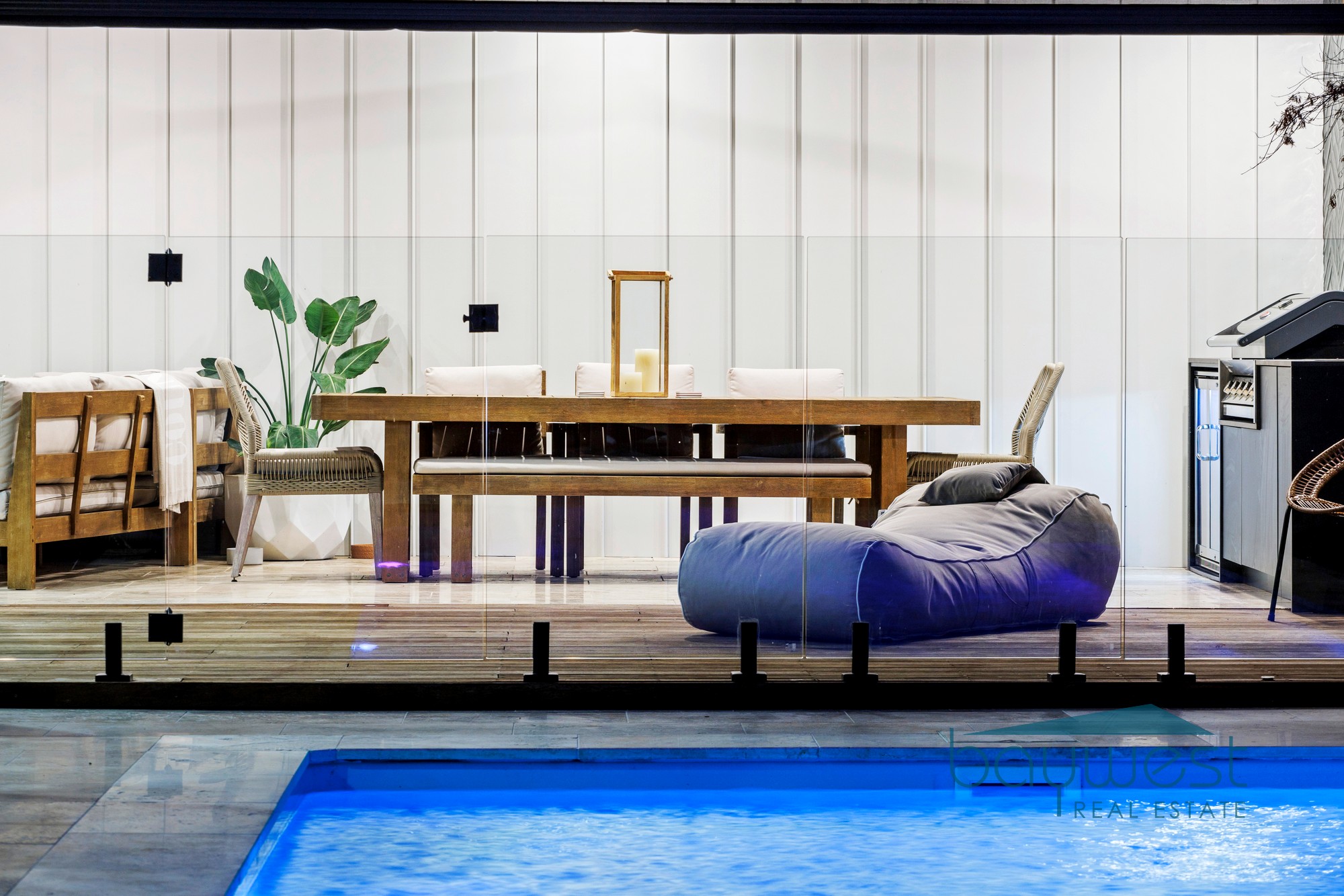 The heart of the home excels in its form and function including an open plan living and dining area overlooking the pool, with fabulous flow out to the poolside alfresco area with beautiful travertine floors, a BBQ kitchen, overhead heaters and auto blinds that enclose the area for year round use.